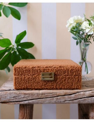 Boîte à bijoux Louise en moumoute marron : • Extérieur lin et intérieur en velours ultra-doux • Plus de 80 emplacements pour vos bijoux • 2 étages dont un plateau amovible • Tiroir modulable