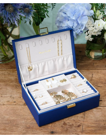 Boîte à bijoux Anne en cuir bleu marine : • Intérieur en velours ultra-doux • Plus de 50 emplacements pour vos bijoux • Dimension 20*20 cm