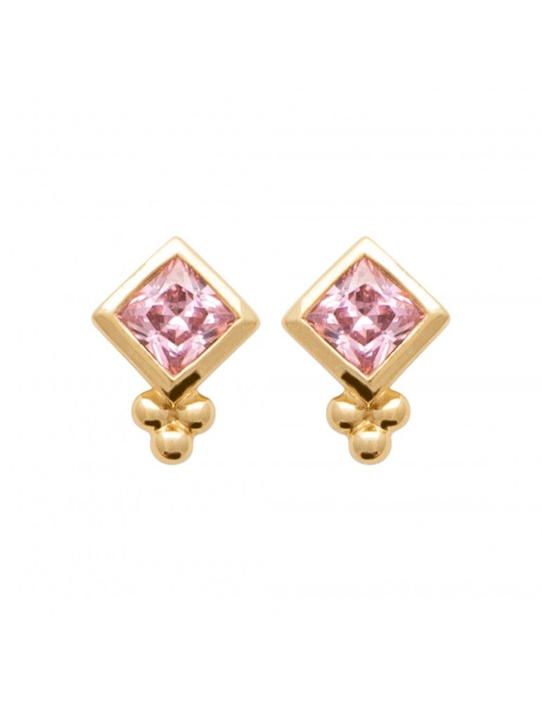 Boucles D'Oreilles Plaqué Or Oxyde Spinelle Rose Coupe Princess Perlé Femme
